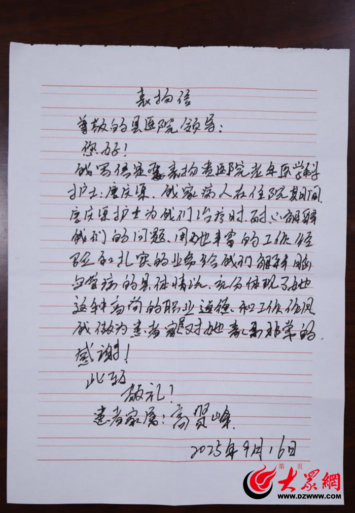 近日,鄄城县人民医院老年医学科再次收到了一封充满温情的感谢信。患者家属高贤峰先生在信中表扬了科室护士唐庆渠,对其在患者住院期间表现出的专业素养、耐心服务和高度负责的工作态度表示了最诚挚的感谢。这封感谢信是对医院优质护理服务工作的生动注脚。